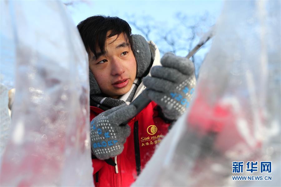 12月27日,选手在比赛中完善冰雕作品。 当日,第十六届黑龙江省大学生冰雕艺术设计创作大赛在哈尔滨兆麟公园落下帷幕,全省高校共有99支队伍参赛。 新华社记者曹霁阳摄