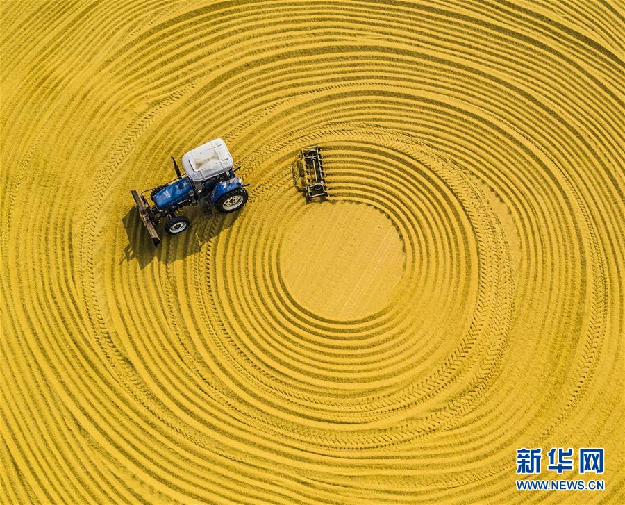 10月23日,在位于江苏泗洪的洪泽湖农场,一台农机在翻晒稻谷。