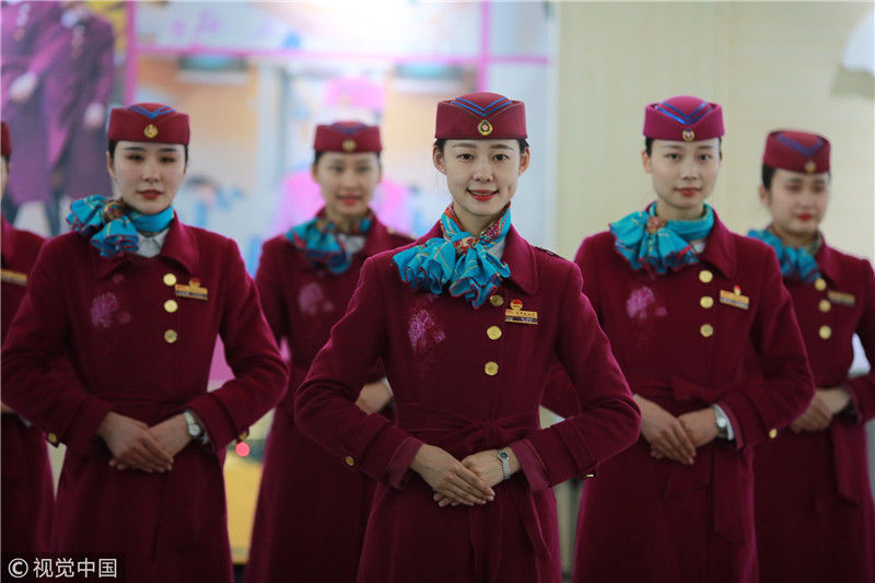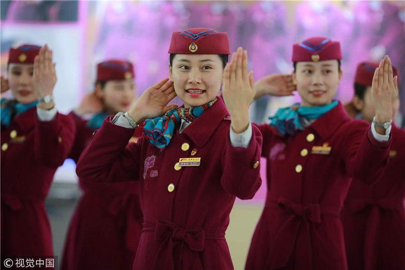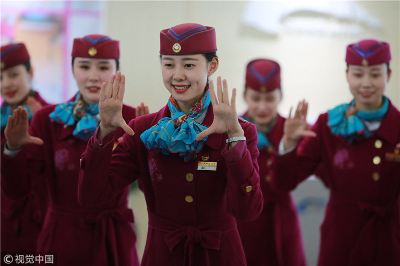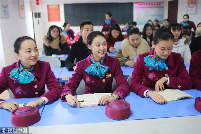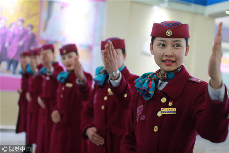 2018年12月27日,四川成都,为备战即将开通的成雅铁路,中国铁路成都局集团有限公司成都客运段动车二队对成雅动车的乘务人员进行理论、形体、服务礼仪等内容的培训。苏志刚/视觉中国