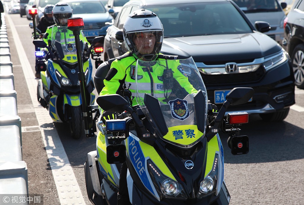 “江北新区分局交警支队大桥特勤队”的骑警队员身着靓丽的荧光绿制服,骑行在南京长江大桥上巡逻。