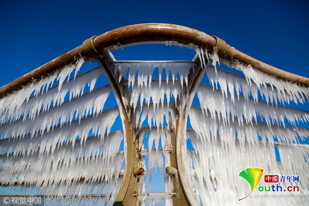 2018年12月29日,大连市迎来入冬以来最冷-12℃的低温,在大风和潮汐的作用下,海水在岸边的护栏上瞬间凝固,凝结并形成大面积形状各异的冰凌,在延绵5公里的木栈道上形成奇特的冰凌奇观。