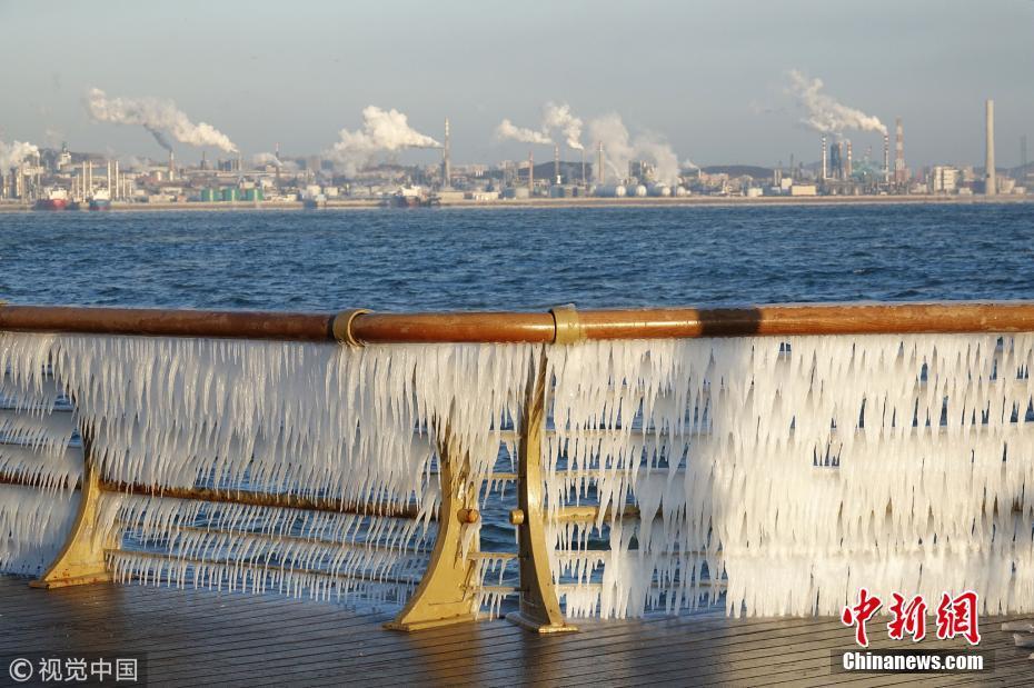 渤海海水在北风的作用下涌向岸边,在大连东港海岸护栏上凝结成冰凌,形成约有两公里的冰凌奇观。图为大连市东港海岸护栏结满晶莹剔透的冰棱。图片来源:视觉中国
