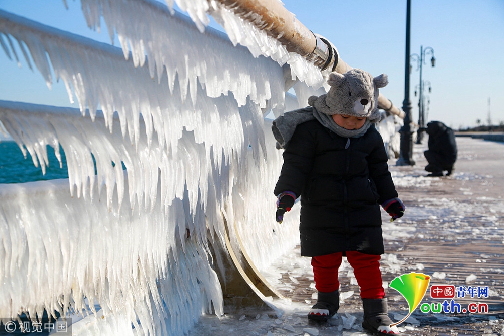 渤海大连北部海域潮水涌上岸边,在堤坝的护栏上凝结成千姿百态的冰凌奇观。