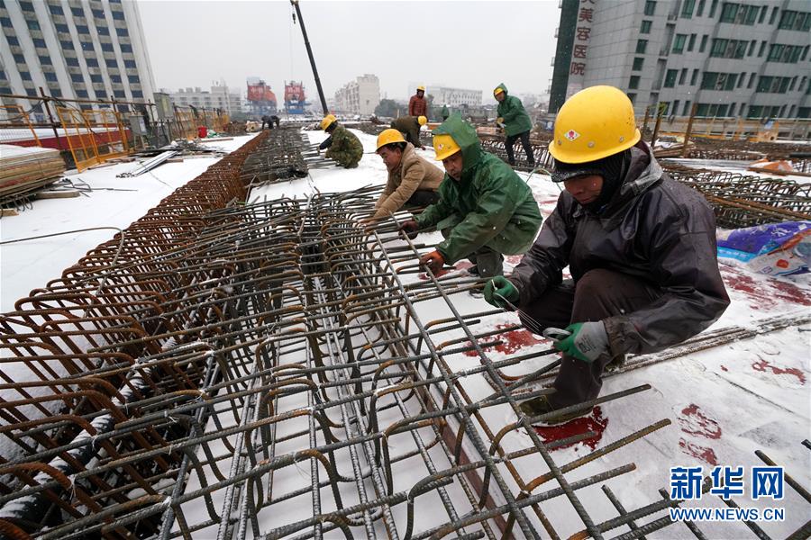 12月30日,南昌市洪都大道快速化改造工程项目工地上,中铁四局五公司职工冒雪作业。新华社记者宋振平摄