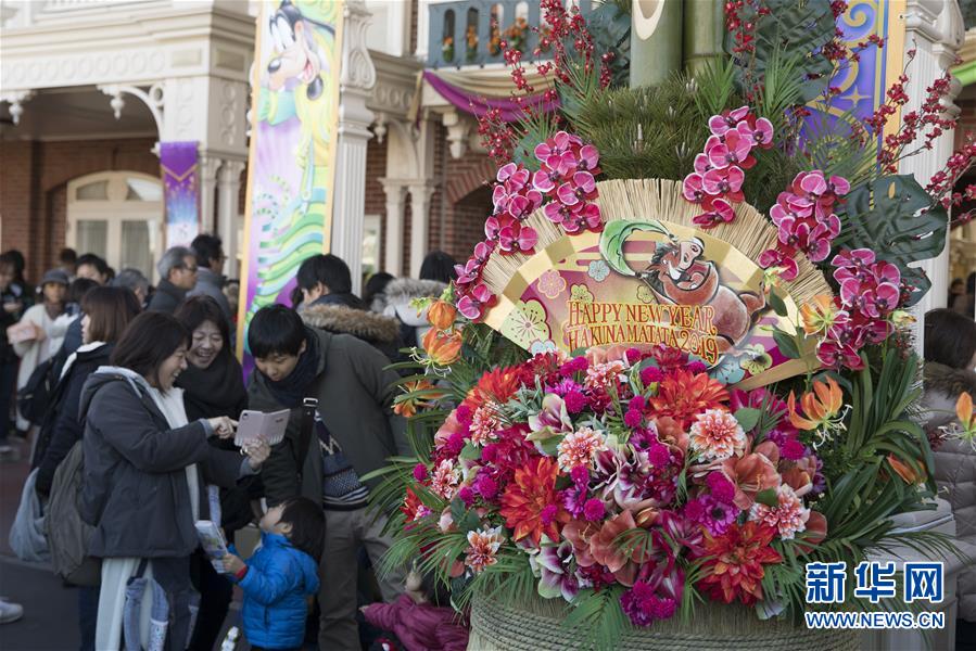 这是1月1日在日本东京迪士尼乐园拍摄的新年装饰。 新华社记者杜潇逸摄