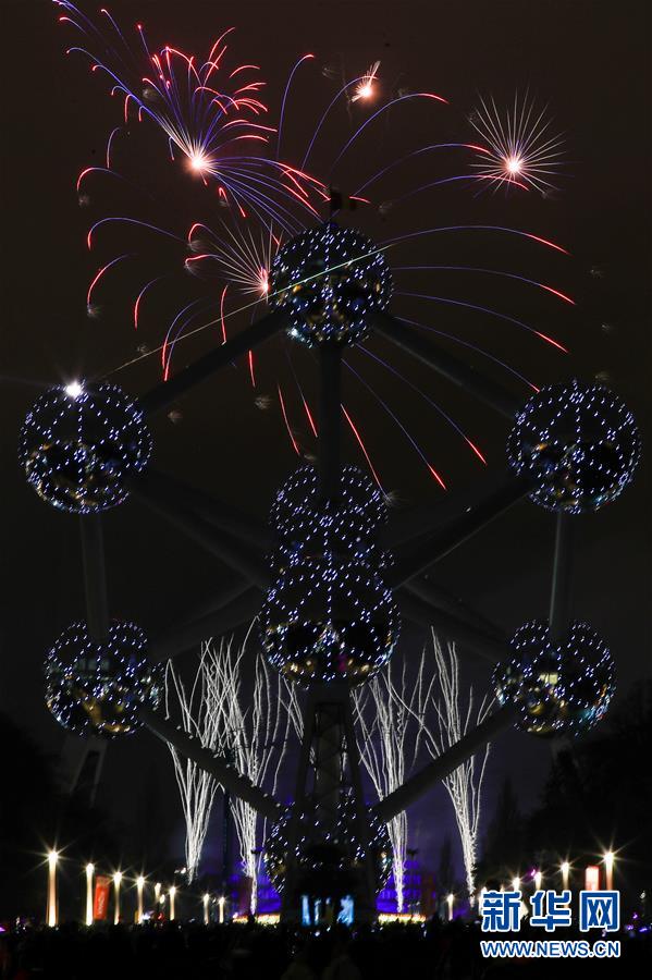 1月1日,比利时首都布鲁塞尔的地标性建筑——原子球塔附近烟花绽放。 新华社记者郑焕松摄