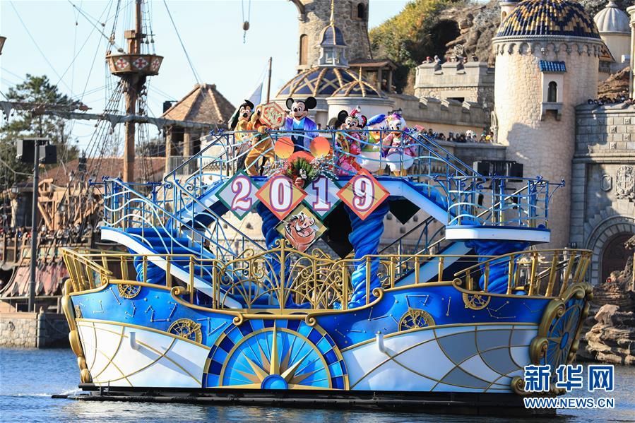1月1日,在日本东京迪士尼乐园,扮成迪士尼卡通形象的演员们在游船上向游客致意。 新华社记者杜潇逸摄