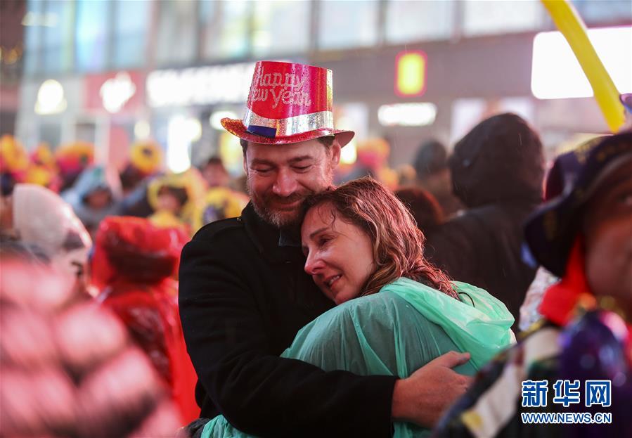 1月1日,在美国纽约时报广场,一对情侣在新年钟声敲响后拥抱。 新华社记者王迎摄