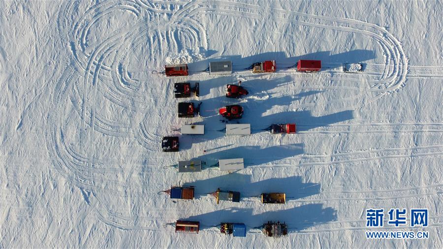 昆仑队距离南极中山站990公里处的营地(2019年1月1日无人机拍摄)。