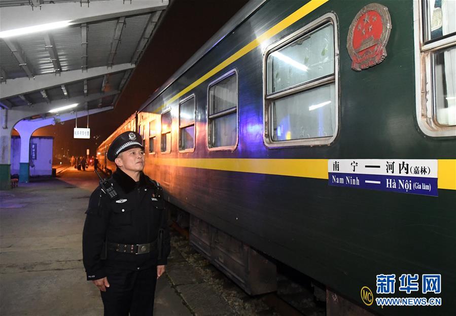 在广西凭祥火车站,铁路公安民警陆日峰在一列准备开往越南的火车旁值勤(2018年12月31日摄)。 新华社记者陆波岸摄