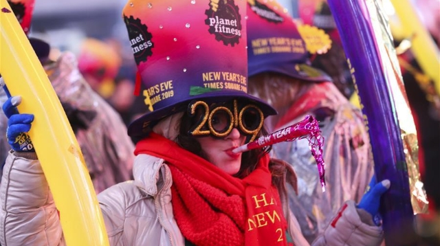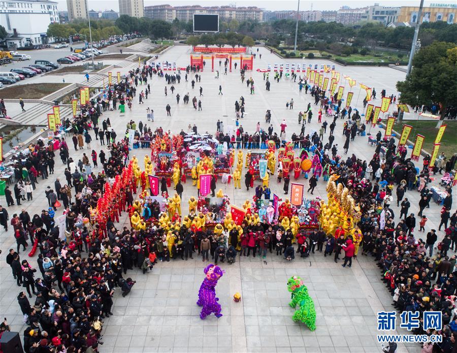 1月1日,演员在展演活动上进行舞龙舞狮等非遗传统文化表演(无人机拍摄)。2019年元旦,浙江省桐乡市濮院镇举办新年“非遗文化艺术节”活动,濮院镇下属多个乡村的传统美食制作、手工艺品、非遗文化表演等乡村特色非遗项目在濮院镇中心广场进行集中展示展演。新华社记者 徐昱 摄