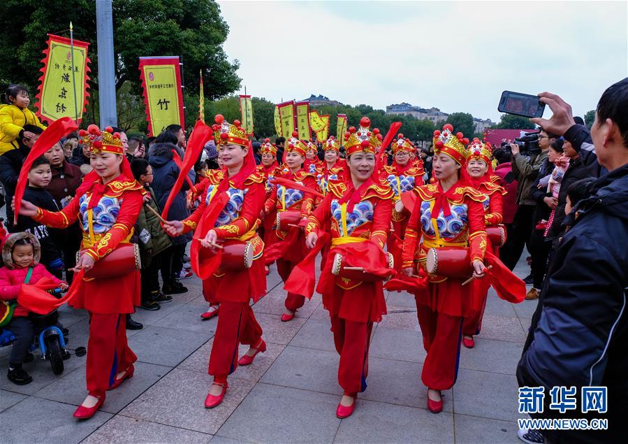 2019年1月1日,演员在展演活动上进行腰鼓表演。2019年元旦,浙江省桐乡市濮院镇举办新年“非遗文化艺术节”活动,濮院镇下属多个乡村的传统美食制作、手工艺品、非遗文化表演等乡村特色非遗项目在濮院镇中心广场进行集中展示展演。新华社记者 徐昱 摄