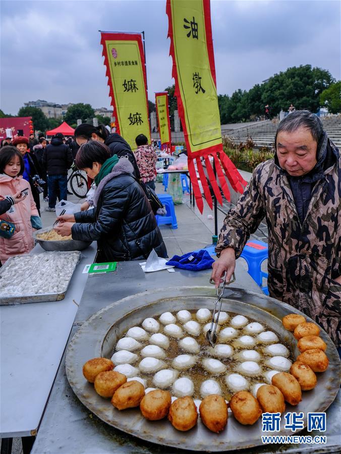 2019年1月1日,居民在展演活动上制作传统美食“油墩”。2019年元旦,浙江省桐乡市濮院镇举办新年“非遗文化艺术节”活动,濮院镇下属多个乡村的传统美食制作、手工艺品、非遗文化表演等乡村特色非遗项目在濮院镇中心广场进行集中展示展演。新华社记者 徐昱 摄
