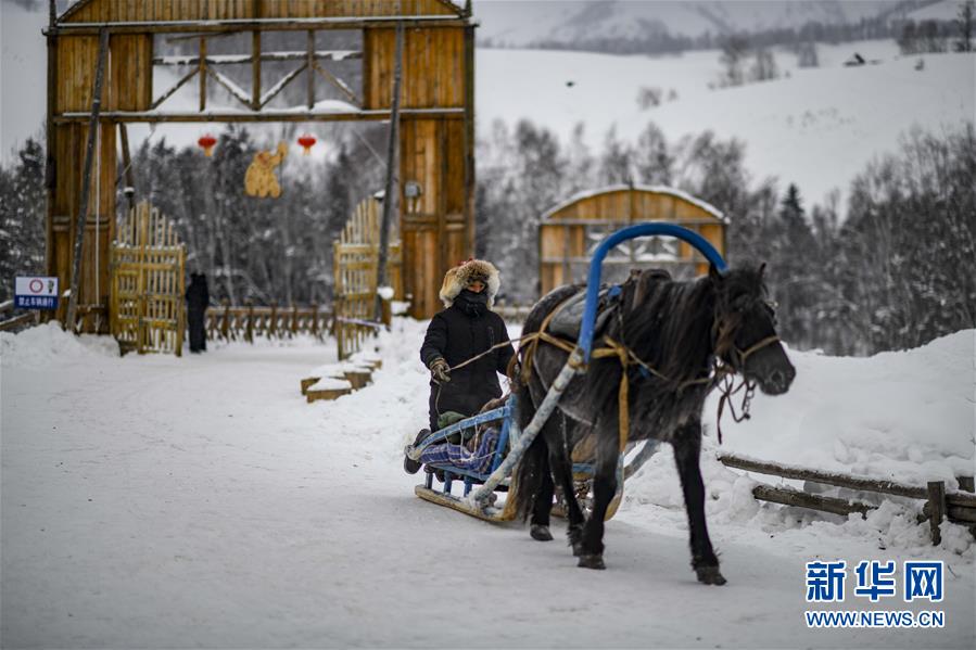 1月1日,在新疆禾木雪乡,一名当地居民驾驶马拉爬犁。