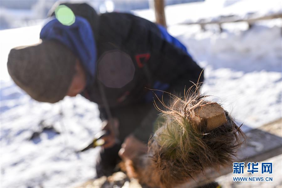 森格尔在新疆布尔津县禾木村的一处冬季牧场制作毛皮滑雪板(1月3日摄)。 新华社记者 胡虎虎 摄