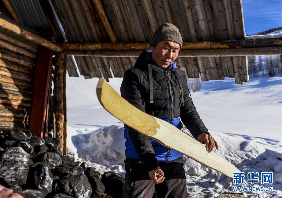 森格尔在新疆布尔津县禾木村的一处冬季牧场制作毛皮滑雪板(1月3日摄)。新华社记者 胡虎虎 摄