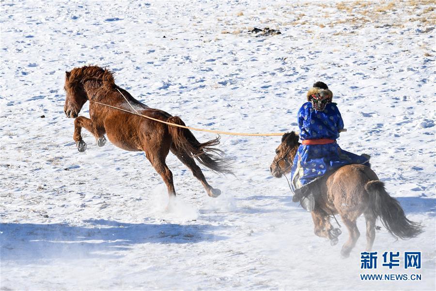 1月8日,牧民进行套马表演。 时下正值草原冬季旅游旺季,内蒙古自治区西乌珠穆沁旗的牧民们在雪原上一展身手,为游客展现独特的民族风情。 新华社记者 刘磊 摄