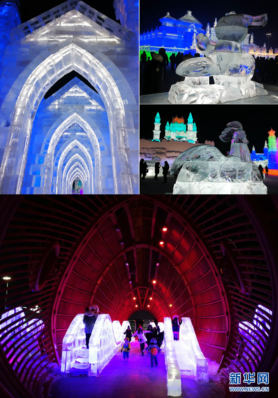 1月5日,游客们在哈尔滨冰雪大世界的各式冰建筑中游玩。 新华网记者 张明宇 摄
