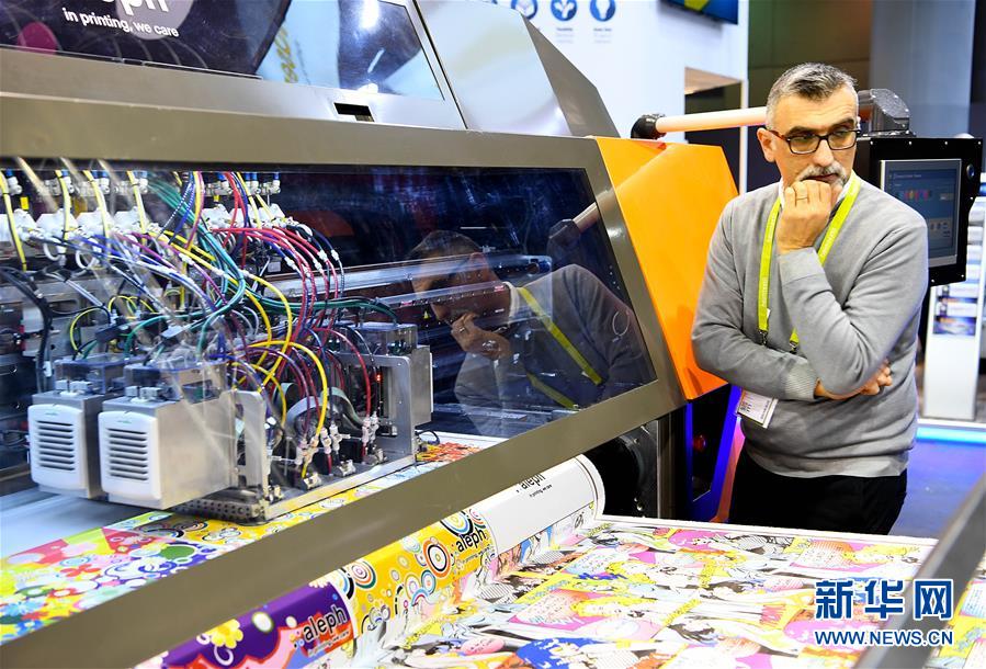 1月8日,在德国法兰克福家纺展上,一名展商站在一台纺织数码印刷机旁。