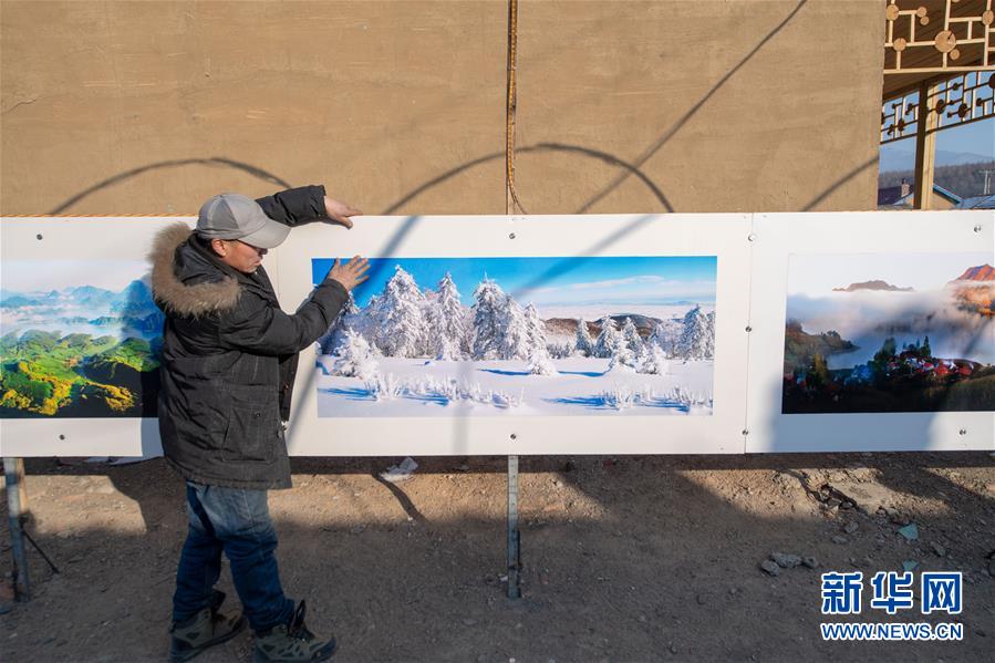 1月10日,在舒兰市二合屯,农民摄影师李志成将摄影作品摆放在小院内供游客欣赏。 新华社记者张楠摄
