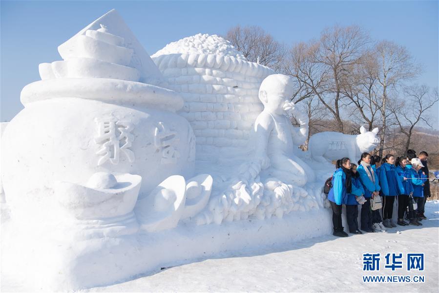 1月10日,在舒兰市二合屯,游客在雪雕前合影留念。 新华社记者张楠摄
