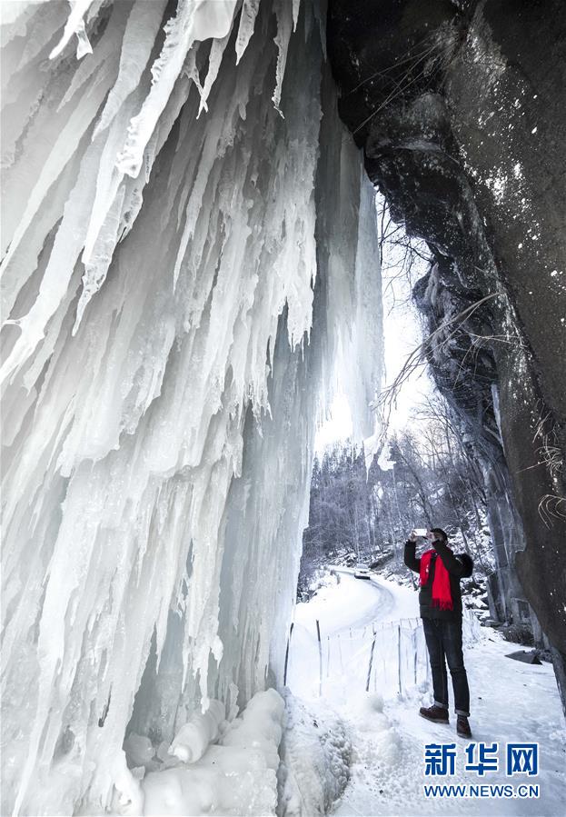 游人在吉林省长白县十五道沟望天鹅景区内拍摄冰瀑景观(1月3日摄)。新华社记者许畅摄