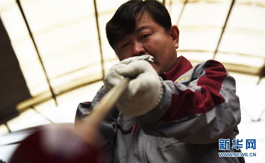 1月12日,孙云毅在吹制鸡油黄琉璃艺术品。