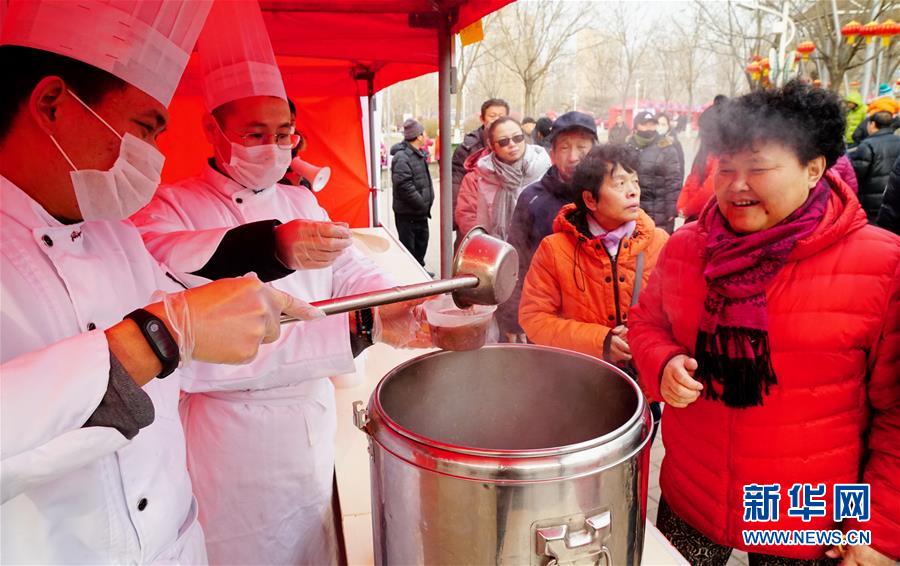 1月12日,人们在年货大集上排队品尝腊八粥。