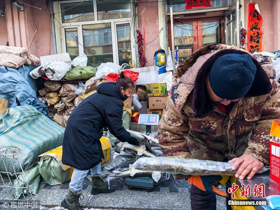 1月12日,黑龙江省佳木斯市抚远东极鱼市,商户在整理冻鱼。棋簿紫 摄 图片来源:视觉中国