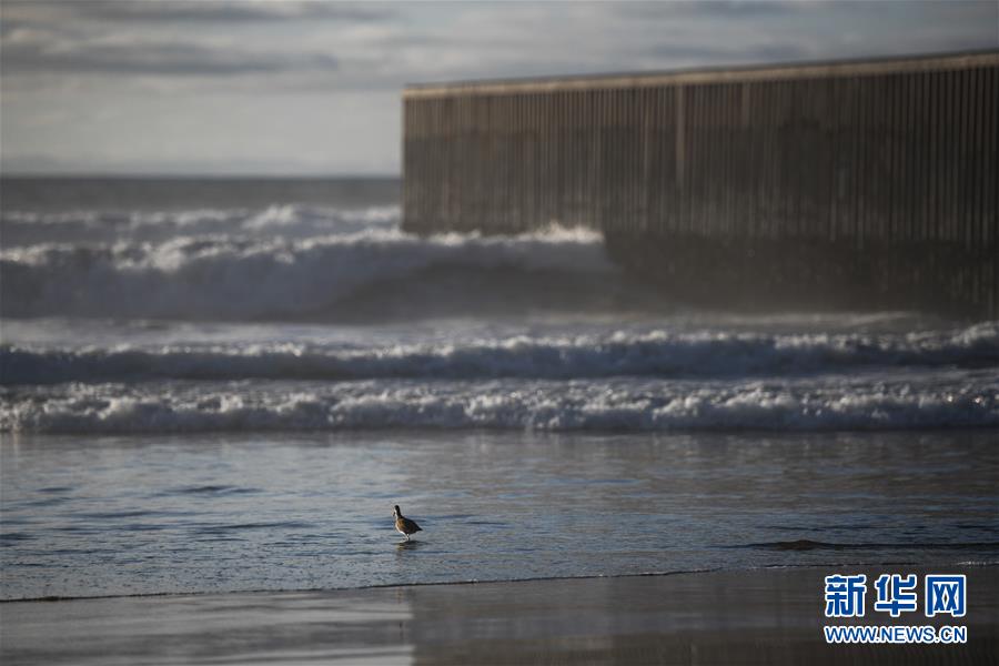 1月10日,在墨西哥边境城市蒂华纳,一只海鸟在美墨边境墙边徘徊。新华社记者 辛悦卫 摄