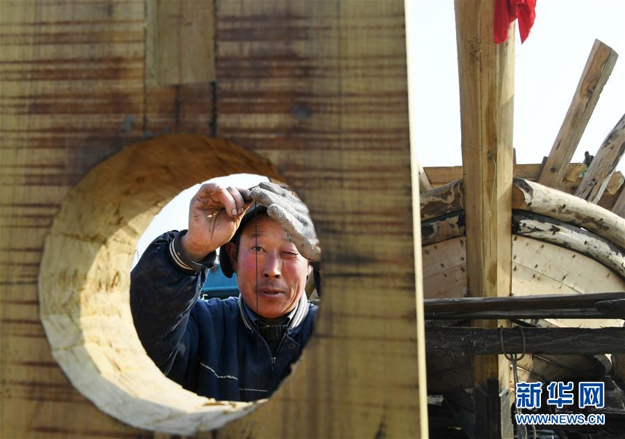 刘双林在用墨斗测量安装角度(1月10日摄)。新华社记者 李紫恒 摄