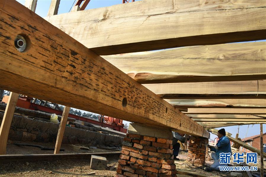 在青岛红双木造船厂,一位造船师傅在检查安装加固龙骨(1月10日摄)。新华社记者 李紫恒 摄