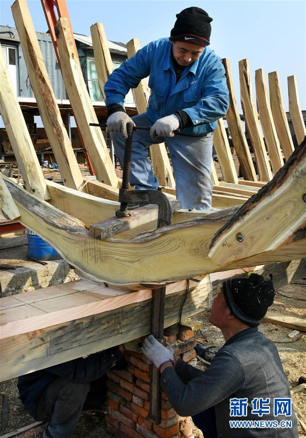 在青岛红双木造船厂,几位造船师傅在安装船肋骨(1月10日摄)。新华社记者 李紫恒 摄