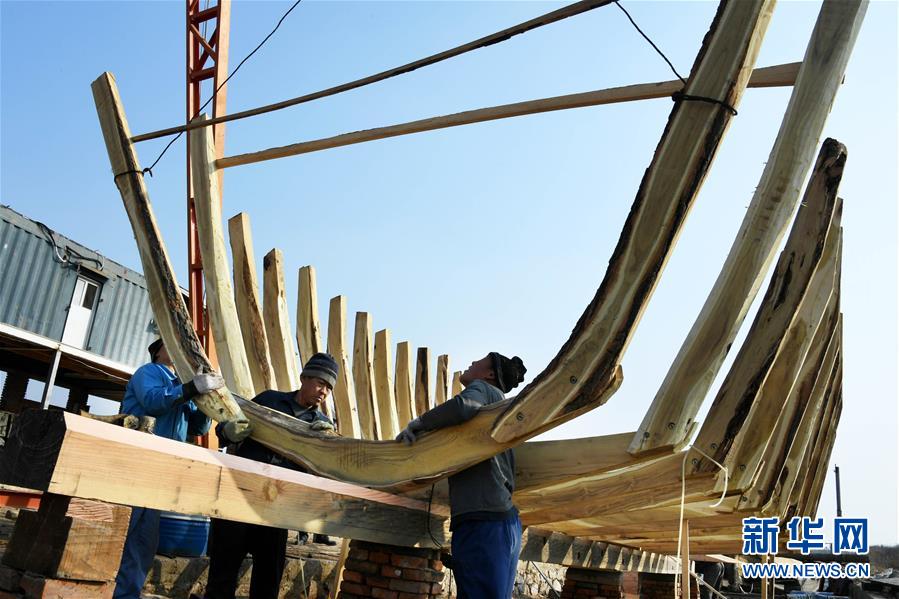 在青岛红双木造船厂,几位造船师傅在安装船肋骨(1月10日摄)。新华社记者 李紫恒 摄
