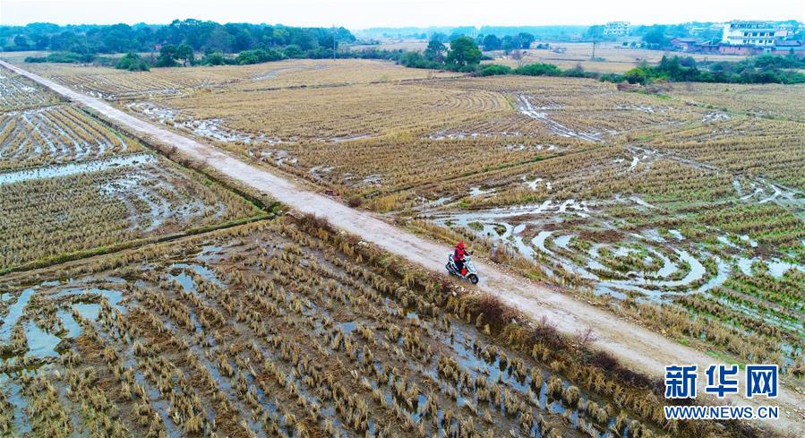 1月3日,章站亮骑摩托行驶在前往学校的路上(无人机拍摄)。 新华社记者 胡晨欢 摄