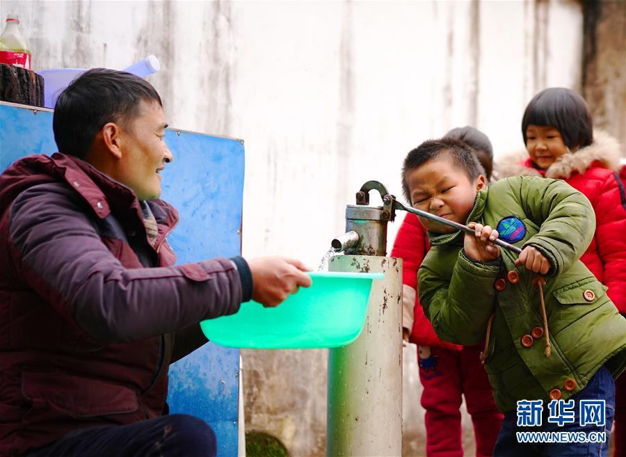 1月3日,黄泥小学的学生(左二)在学校的一口井边帮章站亮打取洗菜所用的水。 新华社记者 胡晨欢 摄