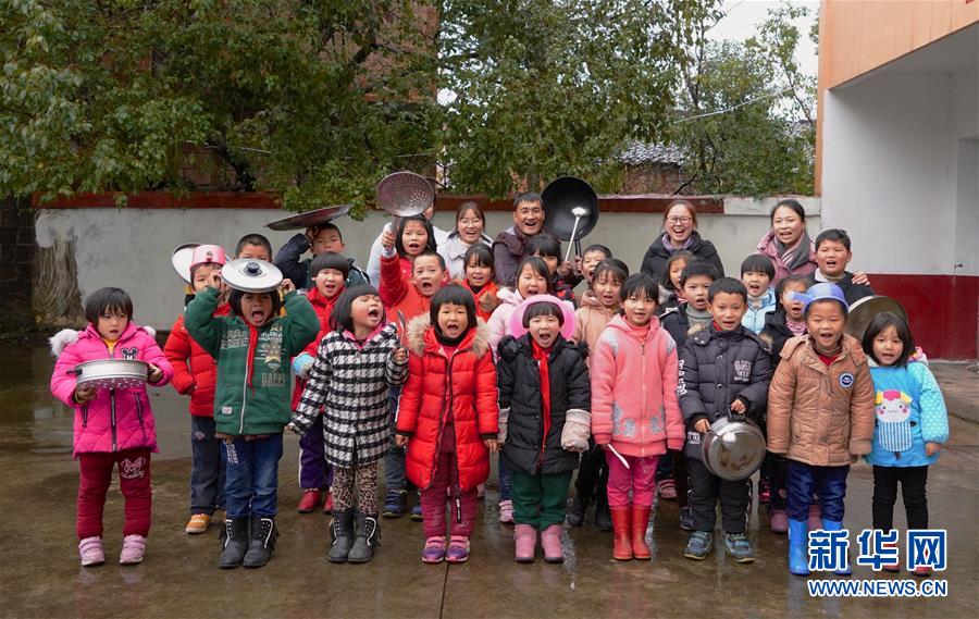 1月4日,章站亮(后右三)和全校的学生以及老师合影。 新华社记者 胡晨欢 摄