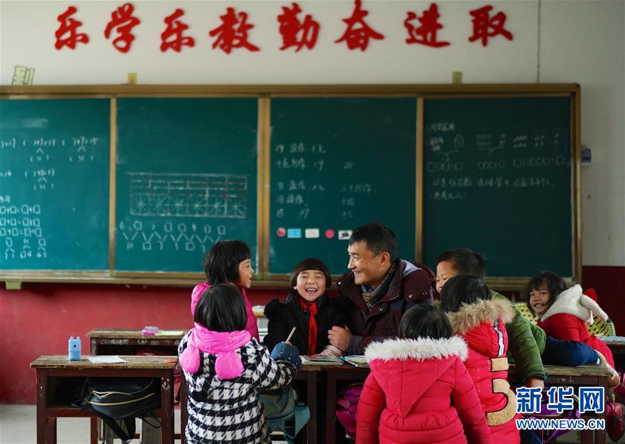 1月3日,章站亮利用课间时间给学生们讲故事。由于黄泥村地处偏远,学生的父母长期不在家,章站亮的故事几乎成为了学生了解外界社会的重要方式。 新华社记者 胡晨欢 摄