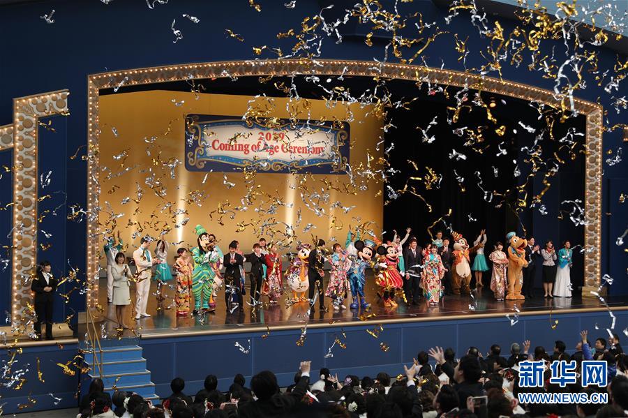 1月14日,在日本千叶县的东京迪士尼乐园,迪士尼卡通人物与参加“成人礼”的年轻人共同庆祝。新华社记者杜潇逸摄