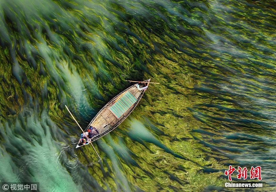 孟加拉国河流清澈见底 渔船畅行水藻间构成美丽图画