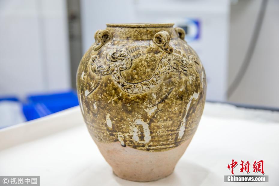 近日,广东省博物馆文物保护科技中心出水文物保护实验室里,一个修复后的出水明代四系酱釉龙纹罐。谭庆驹 摄 图片来源:视觉中国