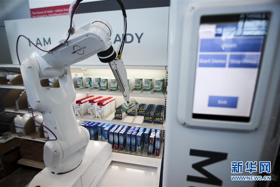 1月14日,在美国纽约举行的全国零售商联合会年度大会的“创新实验室”展厅,自动取货机器人根据顾客的要求抓取商品。 美国全国零售商联合会年度大会于1月13日至15日在纽约举行,许多来自世界各地的展商带来使用新技术开发出的软硬件产品,向观众展示未来零售业的新愿景。 新华社记者 王迎 摄