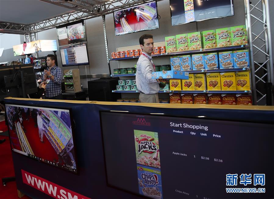 1月14日,在美国纽约举行的全国零售商联合会年度大会的“创新实验室”展厅,工作人员展示可以自动识别商品的智能货柜。 美国全国零售商联合会年度大会于1月13日至15日在纽约举行,许多来自世界各地的展商带来使用新技术开发出的软硬件产品,向观众展示未来零售业的新愿景。 新华社记者 王迎 摄