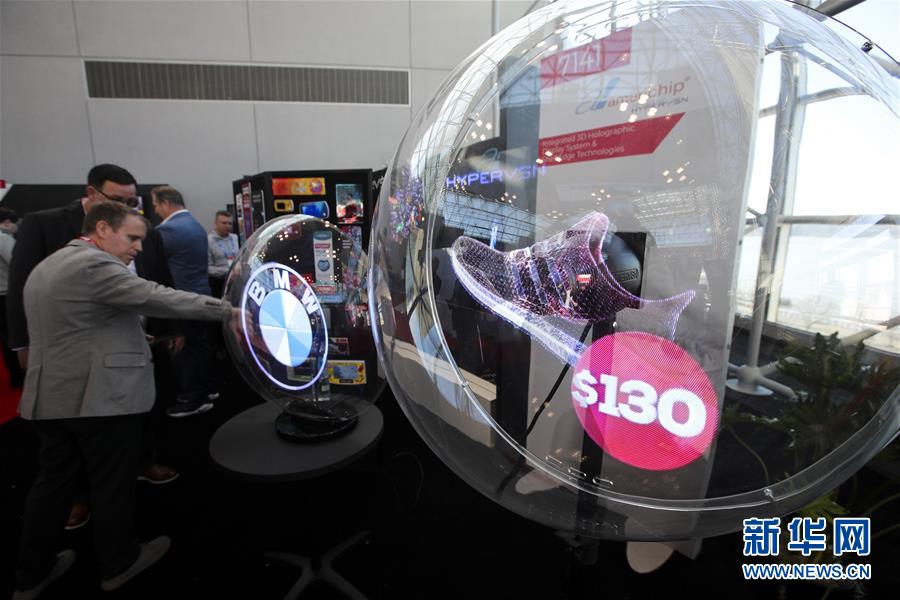 1月14日,在美国纽约举行的全国零售商联合会年度大会的“创新实验室”展厅,参观者观看使用3D全息投影技术的商品展示设备。 美国全国零售商联合会年度大会于1月13日至15日在纽约举行,许多来自世界各地的展商带来使用新技术开发出的软硬件产品,向观众展示未来零售业的新愿景。 新华社记者 王迎 摄