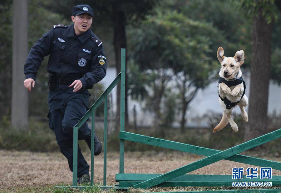 1月15日,警犬“皮特”在训导员丁岩的带领下进行岗前特训。新华社记者 程敏 摄