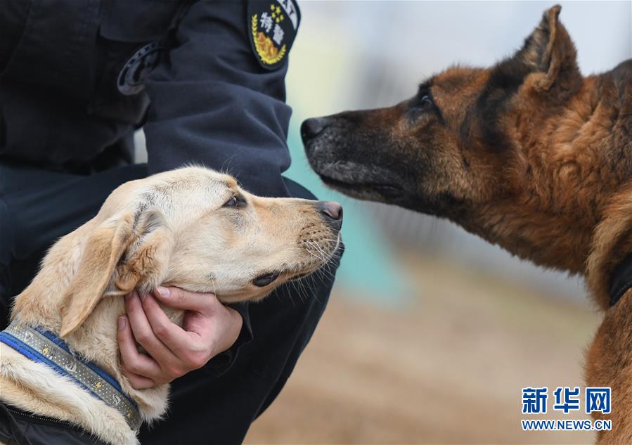 1月15日,即将组成春运搭档的警犬“皮特”(左)和“哼哼”在进行岗前磨合。 新华社记者 程敏 摄