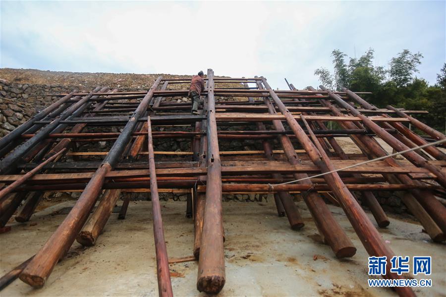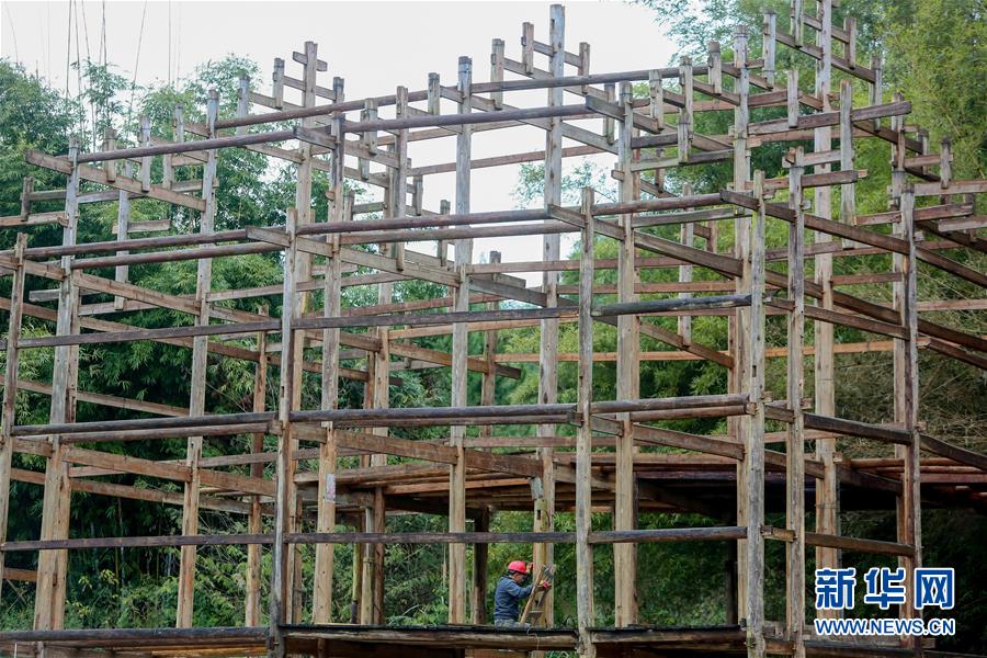 1月15日,在广西融水苗族自治县融水镇梦呜苗寨,一名工人将苗族吊脚楼的主要结构进行“复原”安装。新华社记者 陈君清 摄