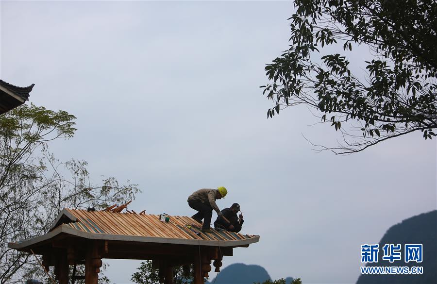 1月15日,工人在广西融水苗族自治县融水镇梦呜苗寨建设房屋。新华社记者 陈君清 摄