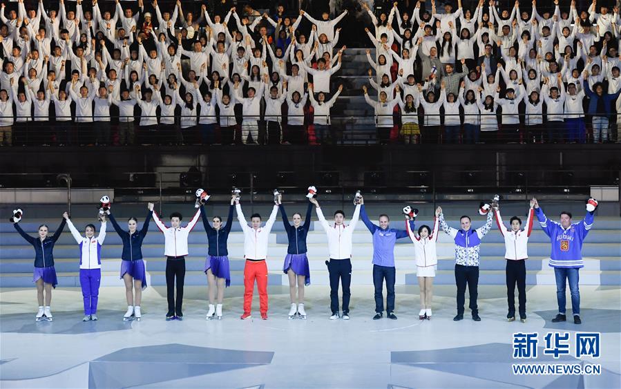 1月15日,中芬运动员代表携手向观众致意。 当日,“2019中芬冬季运动年”开幕式在北京首钢冰球馆举行。 新华社记者申宏摄