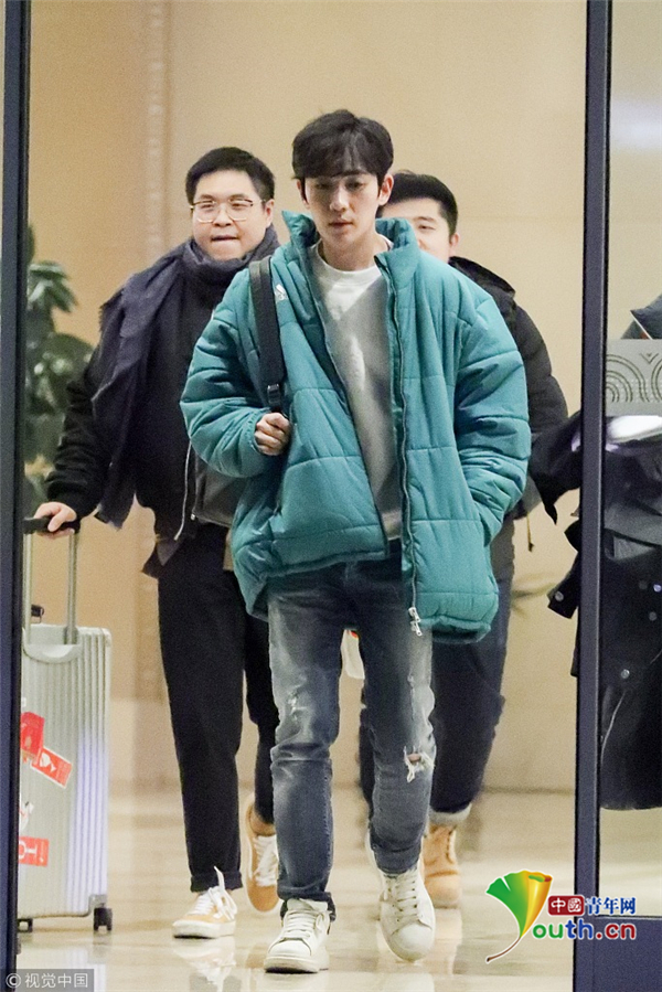 1月15日,北京,朱一龙现身机场。他穿绿色棉袄一路插兜保暖,搭配破洞裤潮范儿十足长腿抢镜,打扮简单毫无男神包袱,看镜头还一脸呆萌,但气质仍然出众。